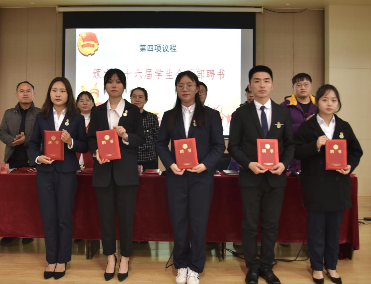 大会第四项,为第16届旅游商务系学生会干部颁发聘书。