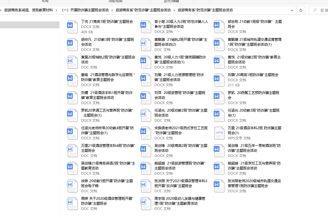 在现如今的社会,诈骗案件越来越多,手段也越来越高明,至开学以来我校发生了多起学生被骗事件。犯罪分子利用一些学生的虚荣心、贪便宜、单纯等心理特点实施各种诈骗伎俩,使部分学生蒙受巨大的财产损失和精神压力。为增强大家防骗意识,提高自我防范能力,旅游商务系安排各班于2022年5月9日召开以“防网络诈骗”为主题的线上主题班会教育。