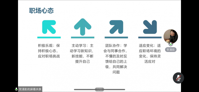 在谈到在职场中的心态时,贺清影学姐分享了自己在面对困难和挑战时的经验。她强调要保持积极乐观的心态,遇到困难不退缩,要有勇气去面对和解决问题。她还鼓励大家要持续学习,不断提升自己,以适应职场的变化和需求。