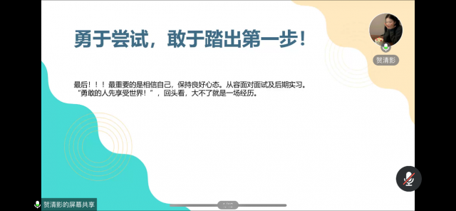 最后,贺清影学姐鼓励大家勇于尝试,敢于踏出第一步。她表示,在求职过程中可能会遇到挫折和困难,但是只要我们保持自信、积极面对挑战和机遇,就一定能够实现自己的职业梦想。