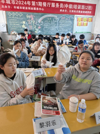 本次培训的主要对象是丰城中等专业学校参加“餐厅服务员”考证的邮轮乘务专业学生,一共40名同学。培训的内容主要包括:餐饮服务礼仪要求、餐巾折花、餐位安排、引领入座、介绍西餐菜品、介绍中餐菜品、介绍菜品典故、介绍菜品营养价值、介绍外国酒、中西餐点菜服务、分菜服务等内容。培训形式主要以理论讲解、案例分析加实操训练等方式展开,同学们积极主动,整个课堂轻松愉悦、丰富多彩。