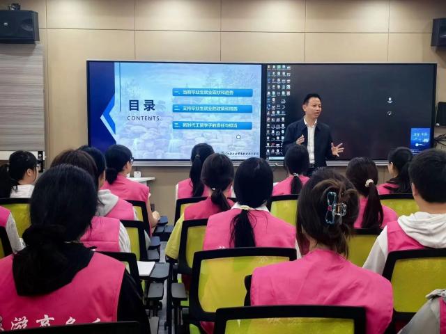 首先,刘国红副院长分别从“认识和了解就业形势”、“支持毕业生就业的政策和措施”、“新时代工贸学子的责任与担当”三个方面讲授课程,鼓励同学们面对竞争激烈的人才市场要认清严峻的就业形势,积极探索、把握机会、学好本领、珍惜时光,做堪当民族复兴重任的新时代好青年。