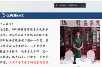 为了帮助同学们明确学习目标,提升学生对旅游专业的认知,提高职业认同感,做好职业规划。2024年5月22日晚上19:00,餐旅教研室主任曾希熙邀请了2020级优秀毕业生毛思怡为2023级旅游管理专业学生开展线上职业生涯规划讲座,本次讲座由辅导员刘萍老师主持。 本次主讲人毛思怡曾获得2022年江西省职业技能大赛高职组餐厅赛项一等奖,在校期间多次荣获二等奖学金、三等奖学金、优秀共青团员、优秀学生干部、爱心志愿者、优秀社员、技能节一等奖等荣誉,通过认真的备考专升本,成功考入豫章师范学院旅游管理专业。