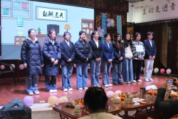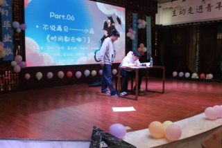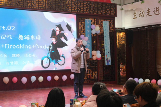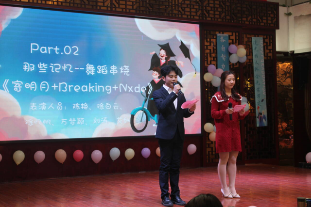 随后同学们观看了毕业纪念影片《暂书至此》,带领大家重温了大学三年的点滴;陈艳、刘涛、徐白云等同学用充满活力与激情的舞蹈串烧《寄明月、Breaking、Nxde》点燃了现场气氛;程泽华、刘飞飞等同学演绎的小品《谁杀死了周日》通过巧妙的情节设置和生动的表演,让观众在捧腹大笑的同时,也引发了对时间管理和生活态度的思考;陈佳慧、郭艳琴、邱乐兵同学带来的歌曲《靠近》带领大家走进了一个抒情的音乐世界;刘新雨同学的脱口秀《恋爱脑》妙语连珠,以独特的视角和幽默的语言讲述了关于恋爱的趣事。