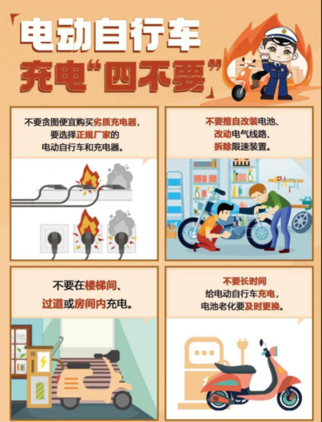 1.有序停放 车辆须停放在指定区域,车头朝向一致,不得占用消防通道、疏散出口等应急设施;禁止将电动自行车驶入电梯或室内停放。 2.安全充电 严禁以下违规行为: 01电动自行车占用堵塞消防通道、消火栓、疏散通道、安全出口、楼梯间、公共门厅等违规行为。 02违反电气安全管理要求私拉电线和插座给电动自行车充电等违法违规行为。 03电动自行车进入电梯、在室内停放充电等违规行为。 04违规将可拆卸的电动自行车蓄电池带至寝室、实验室、办公室等室内充电。 车轮碾过樱花径,安全弦要心中系让我们共同践行文明骑行准则,以规范守护平安,让春日的校园因有序而更添美好! |