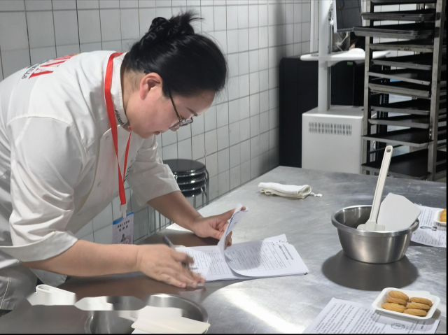实操考场则充满专业活力,分两时段有序推进。黄油香气与烤箱轻响交织,考生们熟练备料称重、揉拌匀料,手持中号八尺曲奇花嘴稳准裱挤,全程紧盯饼干状态,精准调控烤箱温时,凭借娴熟技巧确保成品大小一致、口感松软,用严谨操作诠释匠心。考评人员从制作工艺、外观形态、口感等维度综合考量,公正评分。
