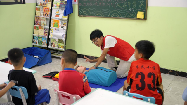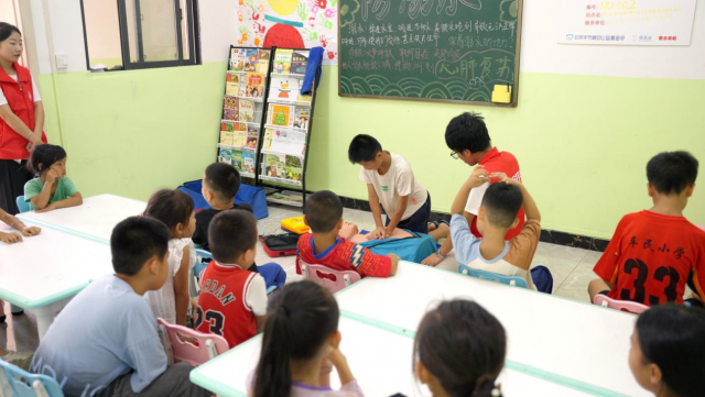 孩子们在课堂上明白了说好普通话不仅是学校的学习需要,更是与人沟通交流的必备技能。此次课堂使儿童初步掌握了毛笔字的基础技巧,通过亲身体验书写过程,儿童感受到了汉字的艺术魅力和普通话的普及价值。 暑期中,防溺水教育是最受关注的教育主题,受到车民街道邀请,“童稚”服务队队员针对社区孩童开展专题“防溺水”爱心课堂。在课堂上,志愿者们组织儿童集体朗读防溺水“六不准”,通过朗朗上口的口诀加深记忆;最后现场演示心肺复苏步骤,指导儿童逐一进行模拟施救,让理论知识转化为实践能力。