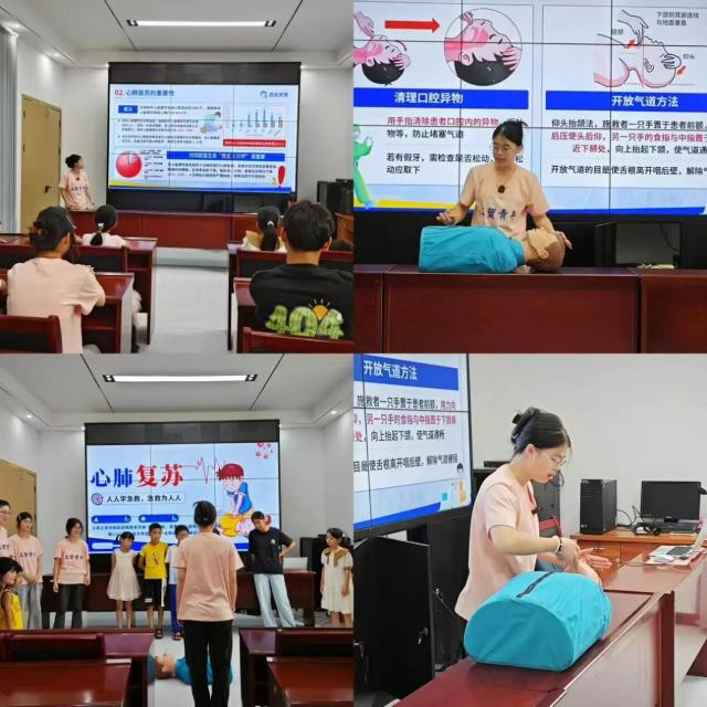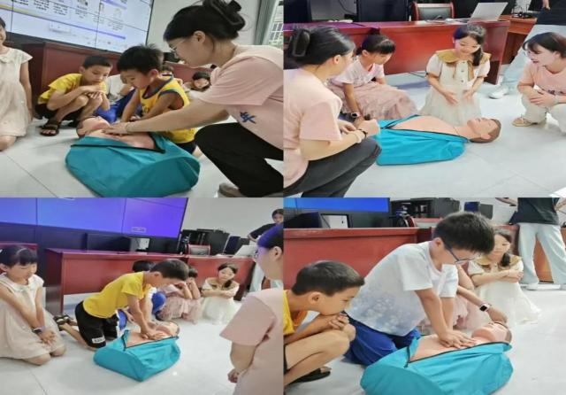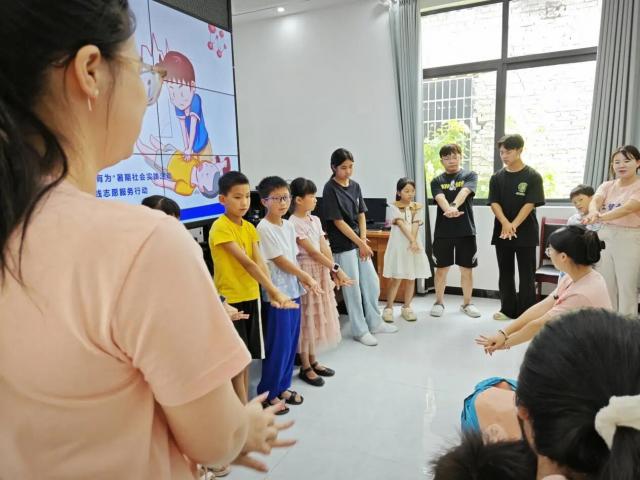 实践环节中,志愿者化身为“生命救护师”。携带专业模拟教具带领孩子们学习心肺复苏实操技能,孩子们轮流上阵在队员一对一的纠正下,逐渐掌握胸外按压的深度、频率,以及开放气道、人工呼吸的操作要点,为孩子们的平安暑假筑起一道坚实的防护墙!