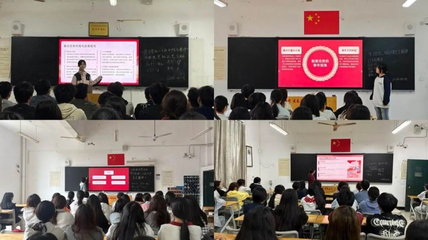 最后,黄昊老师作总结部署,肯定了本次活动的扎实成效,要求全体学子持续深化理论学习,通过班级研讨、主题团日等形式筑牢思想根基;坚持学用结合,立足专业勤学苦练,提升解决实际问题的能力;强化使命担当,在志愿服务、专业实践中践行青春誓言。这次座谈会的召开,有效推动了党的二十届四中全会精神在我系学生群体中的落地生根。 支部学习悟精神 全员共学聚合力 为推动党的二十届四中全会精神实现全员覆盖、入脑入心,各班级团支部以主题团日活动、政治学习为载体,开展集中学习活动,构建“团支书带头、全员齐参与”的学习格局,在全系青年学子中引起热议。活动中,团支书化身“宣讲员”,通过领学全会公报原文、解读核心精神、播放专题学习视频等多元形式,向班级同学系统传达全会精神,重点围绕“中国式现代化”“产业升级”“青年担当”等与学子息息相关的内容展开深入讲解。同学们结合旅游商务专业学习、未来职业规划等实际,踊跃分享学习心得,热议全会部署对行业发展的指引意义,纷纷表示要将个人成长与国家发展、学院发展同频共振。此次各团支部集中学习,实现了全会精神学习全覆盖,进一步凝聚了全系学子勤学笃行、奋勇争先的青春力量,为将精神伟力转化为成长动能筑牢坚实基础。