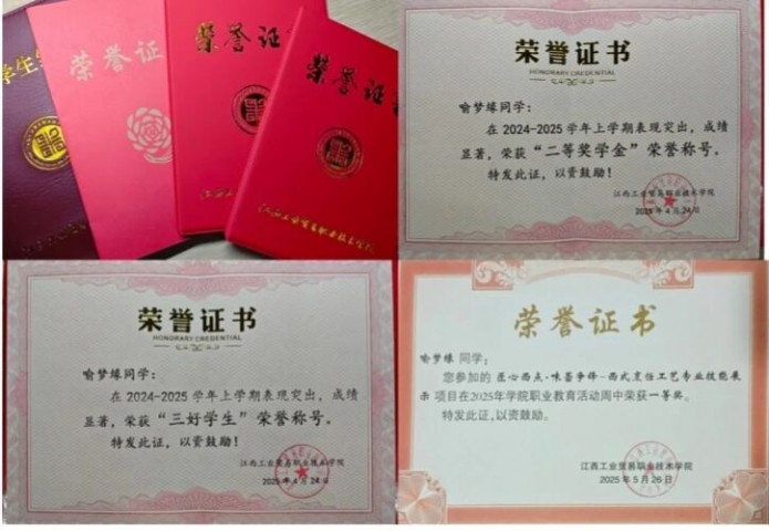 以勤为舟,载梦前行 榜样人物第二十四期—— 喻梦缘 喻梦缘,2023级西式烹饪工艺专业学生。现担任班级学习委员、旅游商务系烘焙社社长。荣获2024-2025学年学院综合素质奖、二等奖学金,获评两次“三好学生”称号,在2025年江西省第二届职业技能大赛中荣获优胜奖、2025年学院职业活动周技能展示中荣获一等奖、2025年鹰潭振兴杯中荣获优胜奖、2024年鸿鹄匠才咖啡师职业技能大赛中荣获优秀参赛选手等荣誉。