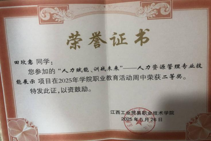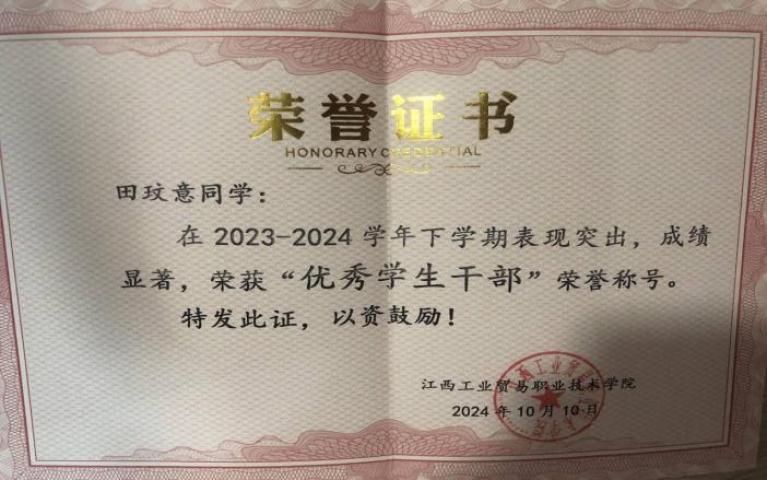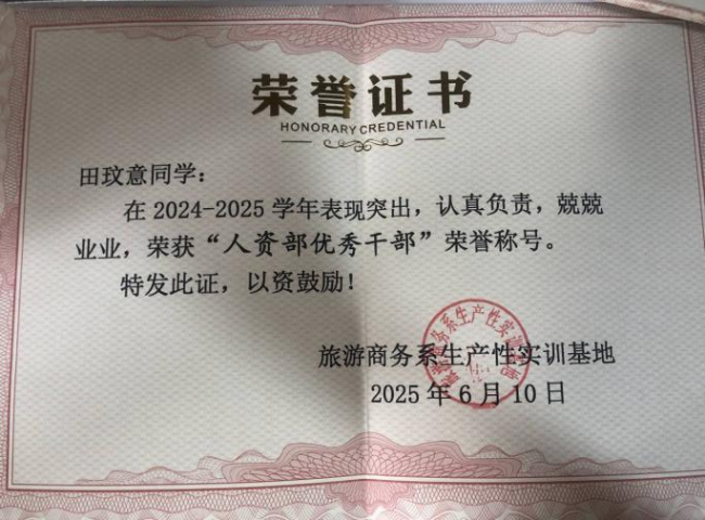 以行践志,心向远方 | 榜样人物第三十一期——田玟意 田玟意,女,共青团员,2023级人力资源管理2班,在校期间担任班级学习委员、系部信息员、人力资源创客空间培训主管。连续两年荣获国家励志奖学金、2023-2024学年上学期综合素质奖学金、三好学生、2023-2024学年下学期综合素质奖学金、优秀班级干部等荣誉称号。 “欲望以提升热忱,毅力以磨皮高山。”2023年秋天,初入大学时,怀揣着对大学生活的向往,抱着提升自我的目标。在开学之初积极参与了班委的竞选,成功担任学习委员。在班级工作中,认真完成老师安排的工作,做好老师的得力助手,关心爱护同学、为同学排忧解难,在困难中也更加坚韧。在这一过程中,班级的融入感、工作的成就感、自身的幸福感成为了我继续努力的动力。