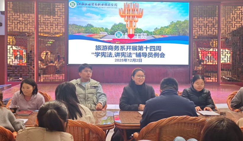 为深入学习宣传宪法知识,弘扬宪法精神,增强师生法治观念,12月2日,旅游商务系以“学宪法,讲宪法”为主题,通过辅导员例会、班长例会、各班级主题班会三级联动形式,开展全方位、多层次的宪法学习教育活动。 当日上午,旅游商务系学生党支部书记、分管学生工作副主任黄婧召开辅导员专题例会。会上,黄婧领学宪法核心条款,强调辅导员作为学生思想引领的关键力量,要将宪法教育融入日常思政工作。全体辅导员围绕“如何创新宪法教育形式”“怎样提升学生宪法实践能力”展开研讨,制定班级层面教育实施方案,为后续活动开展筑牢基础。