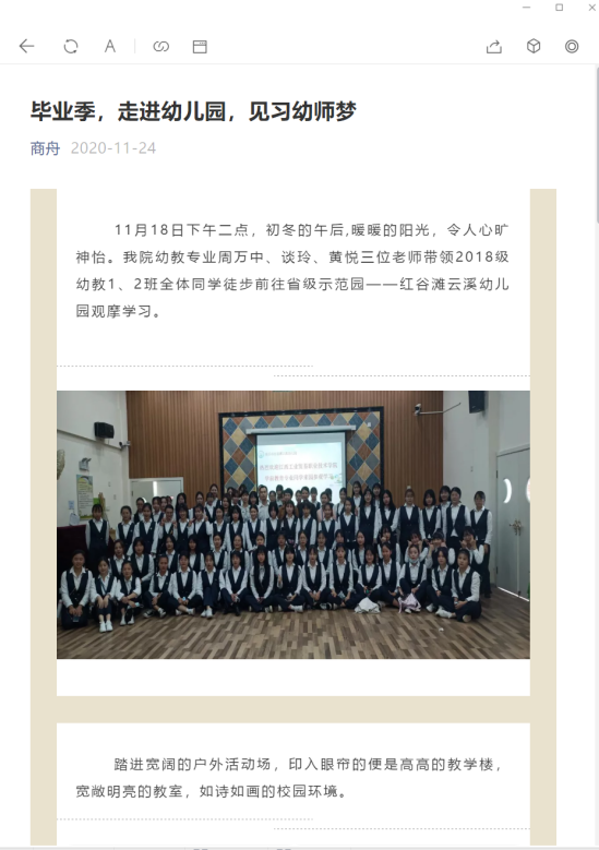 随着我国教育事业快速发展,幼儿教育成为人们关注的焦点,社会越来越需要幼儿发展与健康管理专业的毕业生。我院幼教专业特色是学院与省级示范幼儿园“双主体”培育,双语教学效果好,弹、唱、画、跳、讲,五项技能样样通,高端就业工作稳。