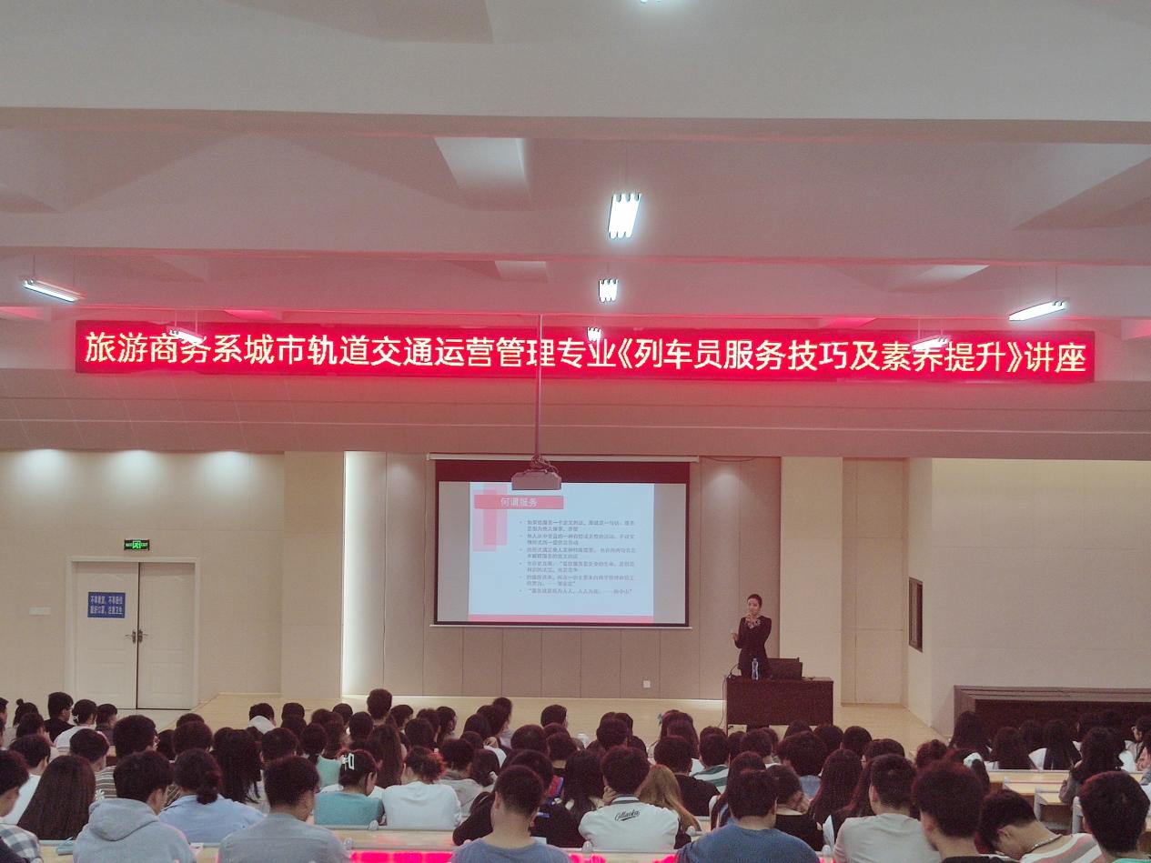 提升旅游商务系城市轨道交通运营管理专业学生的职业素养,旅游商务系于2021年3月29日晚上7点在志学楼504开展《列车员服务技巧及素养提升》讲座,本次讲座特邀南昌铁路局列车长薛凯益女士主讲,轨道教研室主任曾希熙老师以及300名专业学生聆听此次讲座。