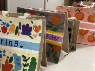 2021年5月21日这个充满爱意的日子里,学院也迎来了第三届“五粮杯”大学生创新创业大赛,旅游商务系的省级示范创新创业基地、创客空间、创业孵化基地及创业一条街共计8个项目参与了本次双创成果展。 旅游商务系创艺宝贝创客空间同学们也整装待发,各显身手,她们用期待的眼神,激动的心情和最好的作品迎接着这次双创节。 党的十九大报告指出:“坚持人与自然的和谐共生,建设生态文明是中华民族永续发展的千年大计。必须树立和践行绿水青山就是金山银山的理念,坚持节约资源和保护环境的基本国策,像对待生命一样对待生态环境”,所以本次双创成果展选取的主题是“手绘黄麻手袋”,黄麻纤维具有巨大的环保价值,在负责人孙莉老师的指导下,创艺宝贝们融入了自己的无限创意,将自己的环保理念描绘在手袋上。我们以手绘心,物以致用,经过前期的精心准备,制作出了一个个让人赏心悦目的环保麻布袋。