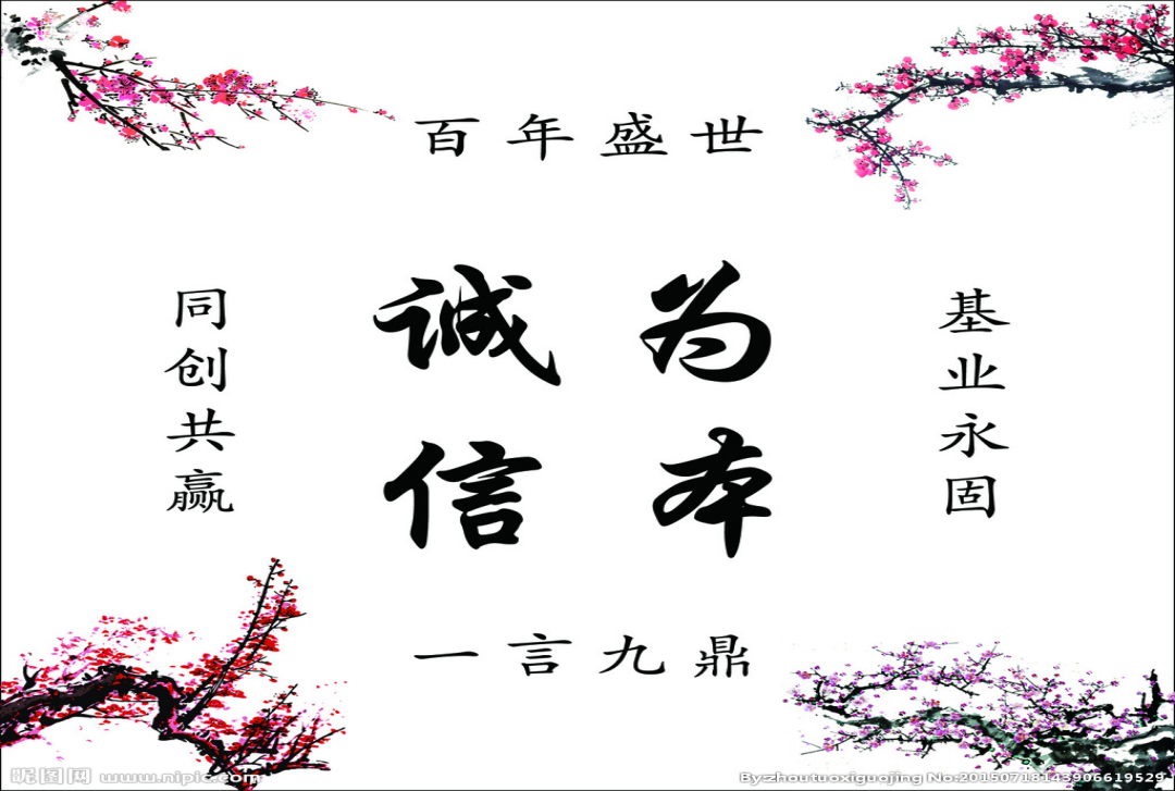诚信是人际交往的名片,做人之本,从业之要,为商之道。讲信誉、讲承诺是自古以来人们公认的道德规范。中华民族从古至今就是礼仪之邦,以诚为本、信之根!