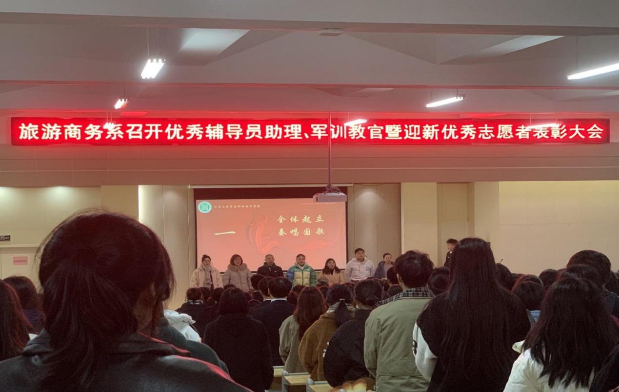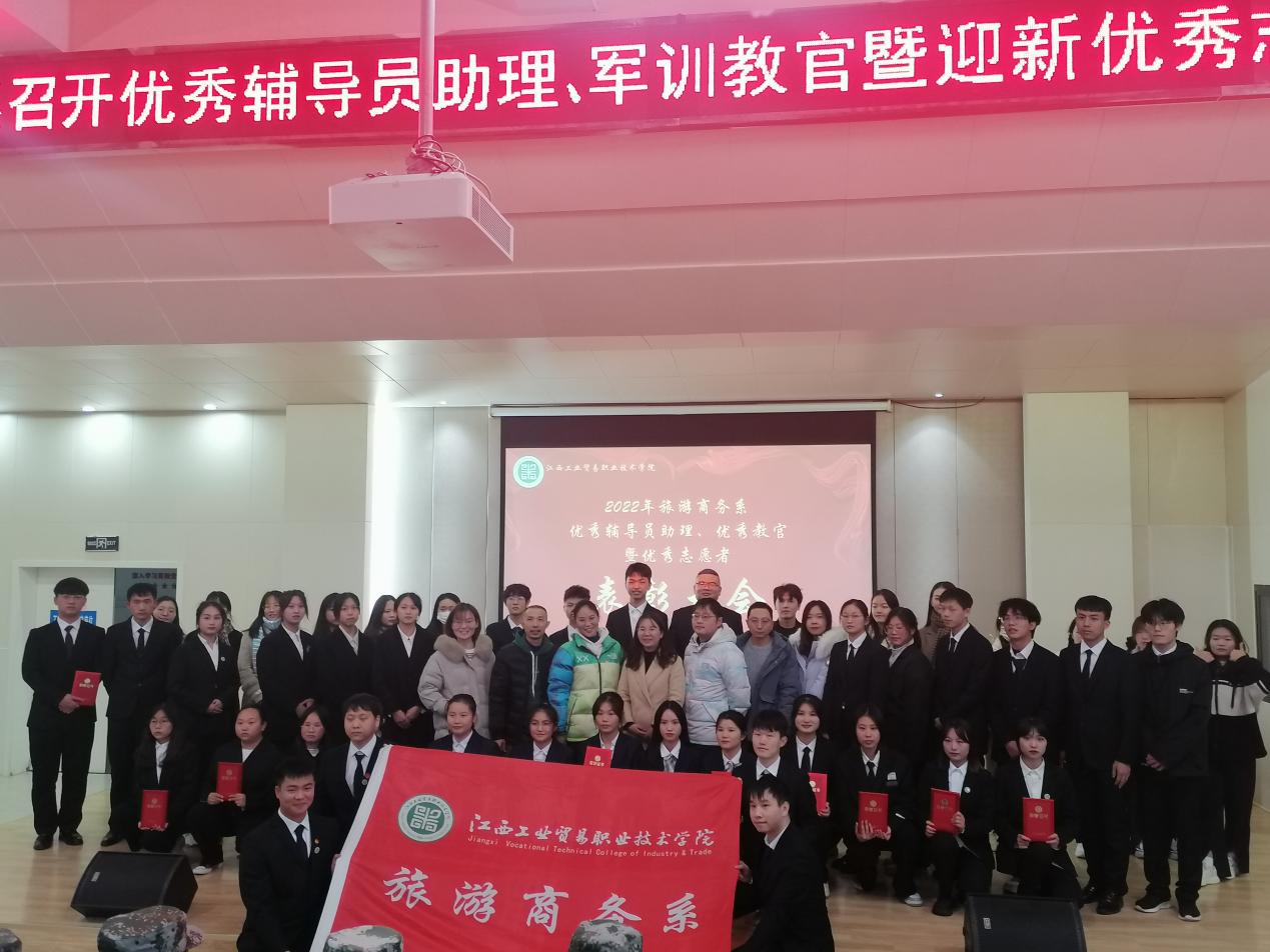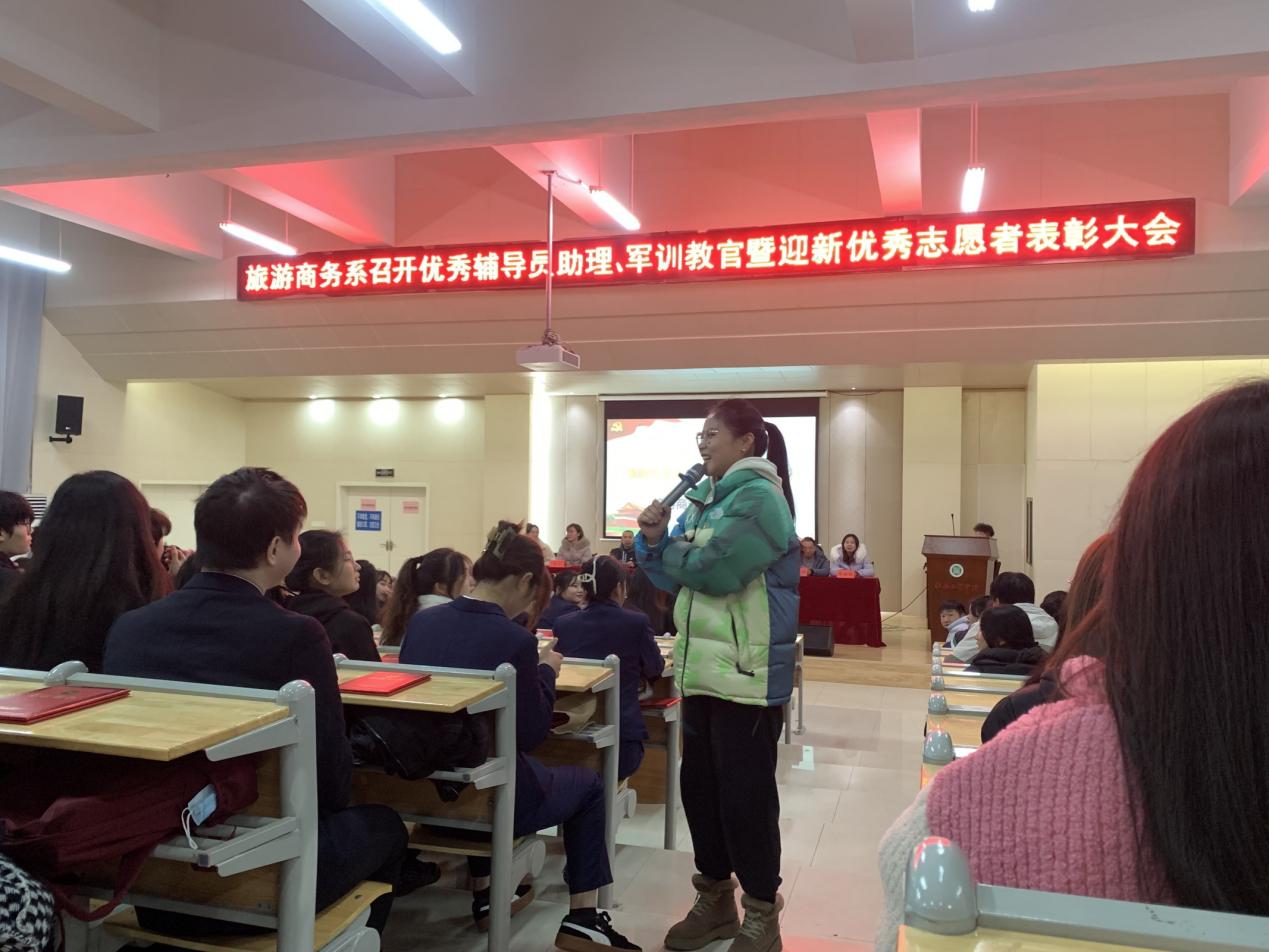 为表彰先进、树立典型,弘扬“奉献、友爱、互助、进步”的志愿者精神,2022年12月5 日晚上18:30,旅游商务系在志学楼504召开优秀辅导员助理、军训教官暨迎新优秀志愿者表彰大会,此次表彰大会由学管员刘萍老师主持,旅游商务系黄婧副主任、旅游商务系组织委员任涵光、团总支书记黄昊老师、班主任张洪照、彭芸、汪思园、熊超越老师参加了本次表彰大会。