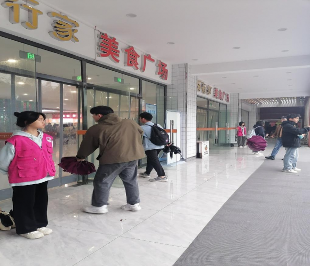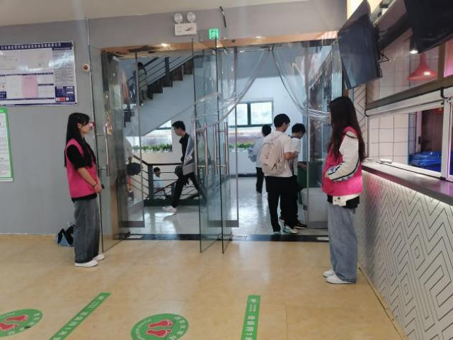 为了保障学生安全,有序引导学生进出食堂,全心为学生服务,营造“暖心”食堂,并进一步增强全院师生的安全防范意识。旅游商务系于2023年4月23日起每周五安排学生干部分别在食堂大门口、扶梯口、电梯口、1-3层楼梯平台及楼梯中间平台进行值班引导工作。