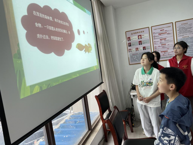 接下来由陈雨欣带来《小猪和小熊》的故事,给孩子们展现出了小猪和小熊纯真的友谊,让孩子们学习到了朋友之间应该相互帮助,相互理解支持,引导孩子们乐于助人促进彼此之间建立积极的人际关系。两位主讲人的故事说完后,志愿者们便邀请小朋友上台通过角色扮演的方式来分享狐假虎威的成语故事。