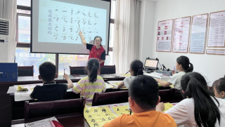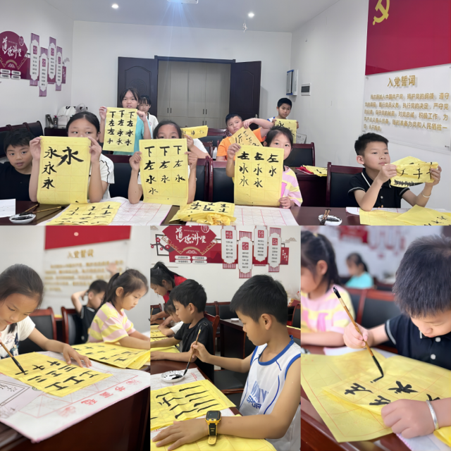 在学习了普通话和规范字的基础知识后,李梦珊对孩子们提出了“软笔书法有哪些字体?书法家又有哪些?”的问题,大家齐声回答到有楷书、行书、草书……当提到书法家时,大家都不约而同想到王羲之。随后志愿者让孩子们观看“王羲之吃墨”的视频小故事,并告诉他们无论做什么事情,只要勤奋刻苦、专心致志,终会有一番成就。接下来,为了保证孩子们有一个书写自如的状态,廖姝涵还讲解了正确的写字、握笔姿势和笔画的基本结构。听完后,孩子们便迫不及待地开始拿起笔来练习书法。