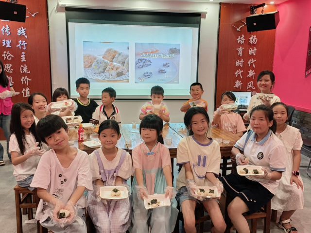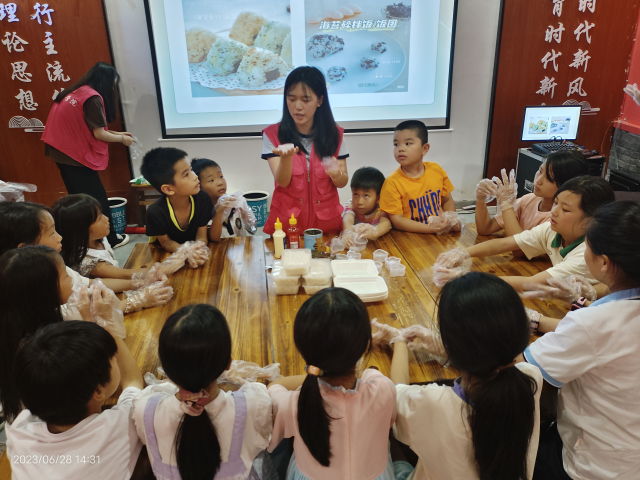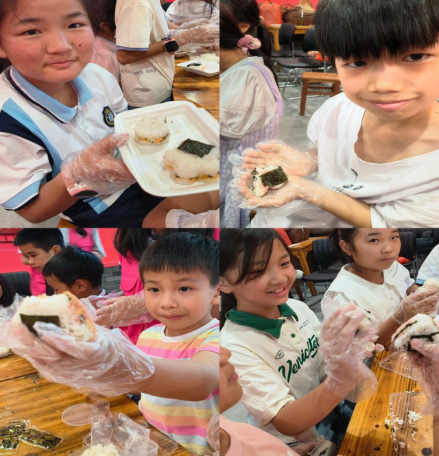 曾微还利用全球浪费粮食的数据来告诉孩子们浪费粮食的危害,倡导孩子们在日常生活中要节约粮食,从点滴小事做起。随后,为了将爱粮节粮的理念贯穿实践,志愿者带领孩子们开始制作海苔饭团。 孩子们带好手套后就开始按所学步骤制作起来,在制作过程中,志愿者们边观察边协助完成。美味的海苔饭团出炉后,孩子们都迫不及待的开始品尝起美食并分享喜悦。