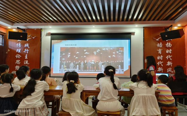 百年党史进富林,红色基因代代传 上午10点,志愿者们为富林村的孩子们开展了以“童心向党,幸福成长”为主题的党史教育活动。主讲人曾微先是带领孩子们了解中国共产党诞生的历史背景,讲解了党徽和党旗的含义,让孩子们对中国共产党的成立有了初步的了解。接着通过节选党史专题动漫《血与火》的片段让孩子们身临其境地感受中国共产党的光辉历程。看完视频后,孩子们更加坚定了听党话、跟党走、做社会主义合格建设者和可靠接班人的决心。紧接着主讲人曾微向孩子们讲述了南昌起义和井冈山会师的红色文化故事,告诉大家今后要好好学习党史,传承好革命精神,把红色基因根植在心中。