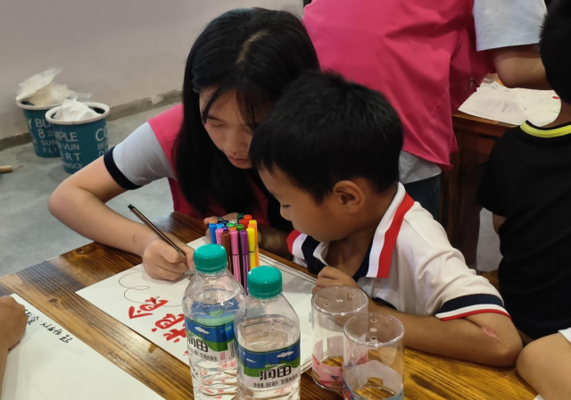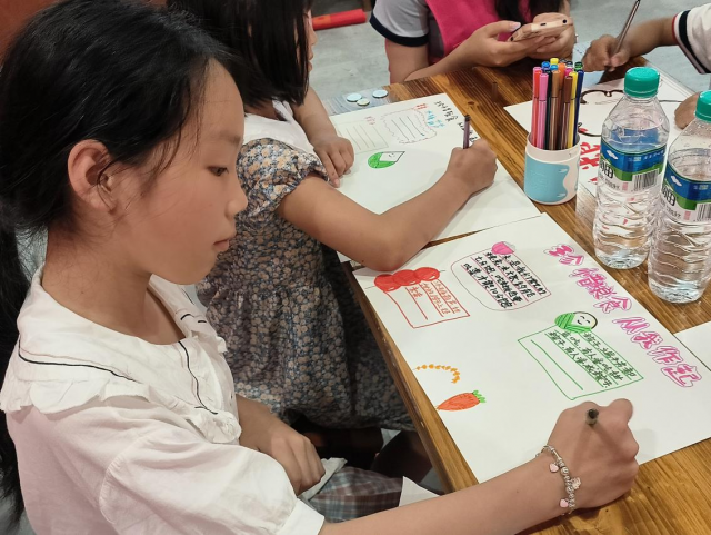 制作完海苔饭团,志愿者带领孩子们做起珍惜粮食的手抄报,在孩子们的精心描绘下手抄报都显得格外生动、贴切。