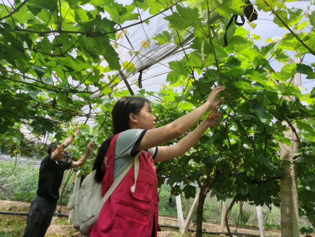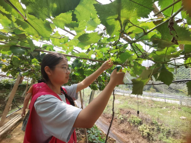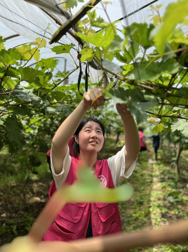 为深入学习贯彻习近平总书记关于“三农”工作重要论述精神,践行“奉献、友爱、互助、进步”的新时代志愿者精神,深入乡间地头,探访贡米原产地,7月1日,旅游商务系“童稚”志愿服务队走进葛毛坞村和荷桥村,探索农耕文化的魅力。 志愿关爱行,期盼好“丰”光 葡萄种植产业作为葛毛坞村的扶贫产业之一,眼下正值葡萄枝芽修剪的黄金时期。为缓解果农压力,助力村民增收,经过前期走访调研和后期沟通,志愿者们二次来到富有有机葡萄采摘园,帮助当地种植夫妇对葡萄树枝进行修剪。“夏天葡萄长得快,枝芽过多会导致植株通风透光不良,对果实产量和品质都会造成很大的影响。”种植夫妇耐心的为我们葡萄树枝修剪的原理,并告诉志愿者们如何正确修剪葡萄树枝。过程中,志愿者们凭借一把小剪子,干的热火朝天,认真修剪着葡萄树枝,在他们眼里,一颗颗饱满的葡萄,都是农户致富的果子,都是通往乡村振兴的硕果。