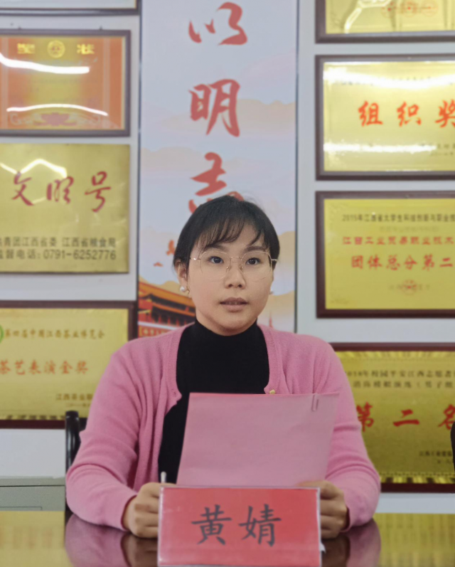 议程第四项由旅游商务系学生党支部书记黄婧老师致词。她指出,一要树立正确的理想信念,端正入团、入党动机;二是奋发学习,提升理论修养。要珍惜此次学习机会,除了不断努力学习科学文化知识外,更要学习团的先进思想,从中不断充实自己、提高自己。三是践行行动,发挥模范作用。要时刻以一名优秀的共青团员标准严格要求自己。并勉励大家要克服困难、积极参与、争当模范,早日向团组织靠拢。
