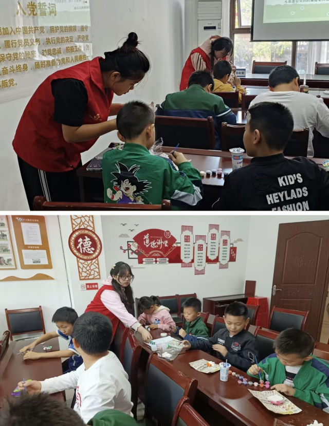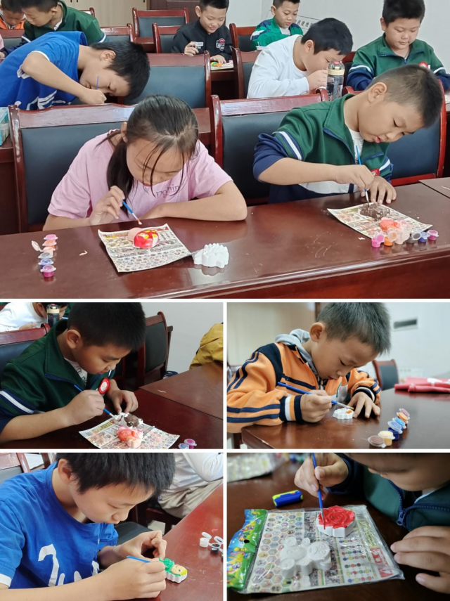 第一件手工的内容是给石膏娃娃上色,小朋友们发挥自己的想象,结合自己的审美,给石膏娃娃涂上精美的颜色,在等待颜料干的同时,志愿者们带领小朋友们去洗手,保持良好的卫生习惯。