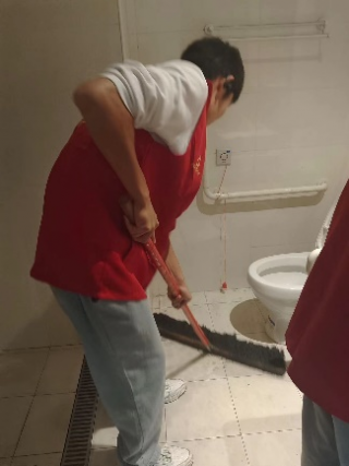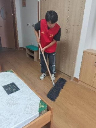 擦洗完桌椅后,志愿者们开始拖地,虽然房间不是很脏但是免不了有灰尘,所以志愿者们很认真的拖洗,不放过一处角落。