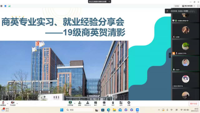 首先,贺清影学姐详细讲述了商务英语在职场中的应用。她指出,商务英语作为国际交流的桥梁,是我们在职场中沟通、谈判、建立联系的重要工具。她鼓励学弟学妹们要扎实掌握英语语言、夯实商务知识,并积极抓住实践机会,以便在未来的就业市场中占得先机。