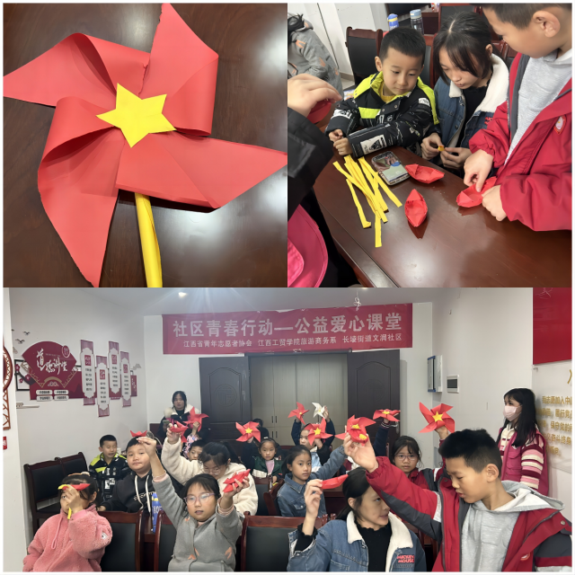 课程讲述之后,志愿者们分发卡纸和画笔给小朋友,教小朋友们制作五星风车和红船,让小朋友们在回顾历史的同时,了解领悟红船精神,志愿者们告诉小朋友们要珍惜现在来之不易的幸福生活,激励小朋友们续写下一个百年风华。