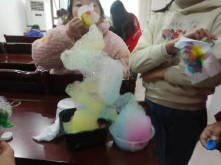课程讲述之后,志愿者们分发手工让小朋友们制作机器人,随后又分发实验材料给小朋友们一起做了彩虹泡泡龙实验,活动过程中奇趣横生,小朋友们也都沉浸在科学的奇妙里。