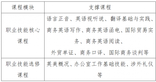 1、扎实英语听、说、读、写、译技能; 2、熟悉外贸业务实践操作流程; 3、以语言为基础,以国际商务为方向,以校企合作为保障,实现高端就业。