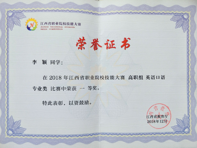 17级商务英语专业学生李颖获2018江西省职业技能大赛“英语口语”(专业组)一等奖