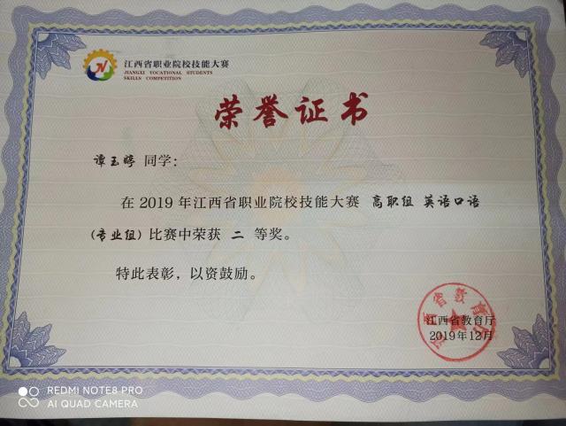18级商务英语专业学生谭玉婷 获2019江西省职业技能大赛 “英语口语”(专业组)二等奖