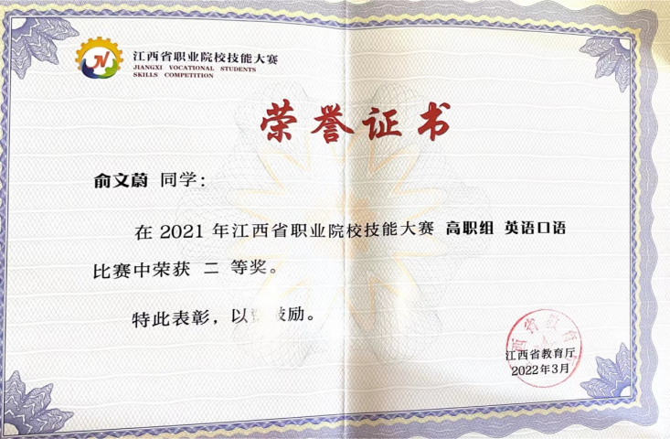 20级商务英语专业俞文蔚获2021年江西省职业技能大赛“英语口语”赛项二等奖