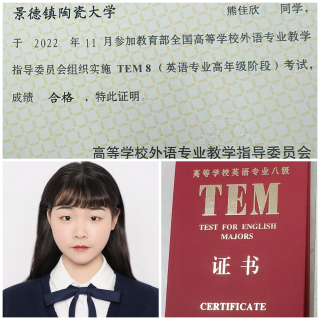熊佳欣 旅游商务系2020届商务英语专业毕业生 先后考取景德镇陶瓷大学就读英语本科 扬州大学就读英语教育硕士专业 本科阶段顺利通过英语专业八级