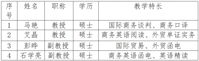 该专业学生就业渠道广阔,培养涉外公司、外贸企业一线需要的高级应用型人才,实现高端就业。商务英语专业毕业生面向的岗位群主要集中在涉外业务员、涉外商务助理、涉外商务文秘三大类别。实际的主要就职岗位有:外贸业务员、中小学英语教师、外贸跟单员、商务助理、商务翻译等。 专业教师中具有专兼职教师9人,副教授以上职称4名,外籍教师1名, 行业专家兼职教师3名,专业现有教学名师4位,名单如下: 马艳老师喜获第45届世界技能大赛中国翻译,江西省仅2人获此资格。