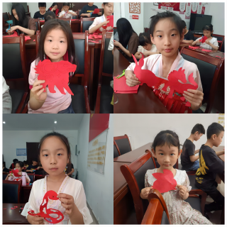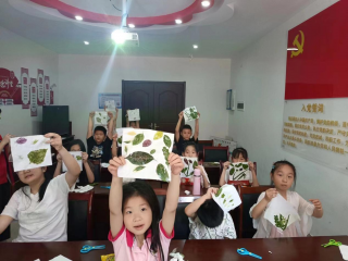 小朋友们认真看视频讲解 在剪纸活动中,志愿者们将准备好的十二生肖素材剪纸分发给每一位小朋友,教小朋友们按照线条的轮廓剪纸,并叮嘱小朋友使用剪刀时要注意安全。   小朋友们的剪纸作品展示 在植物拓染模块中,志愿者们先简单介绍了拓染的步骤以及制作拓染需要用到的工具,并将工具依次发给小朋友们。小朋友们学着志愿者们的样子先将树叶放在白布上,然后用胶带将树叶胶在布上,手握拳状,进行敲打,将树叶的纹路清晰地印在了白纸上,一幅幅原生态的作品出现在了大家眼前。