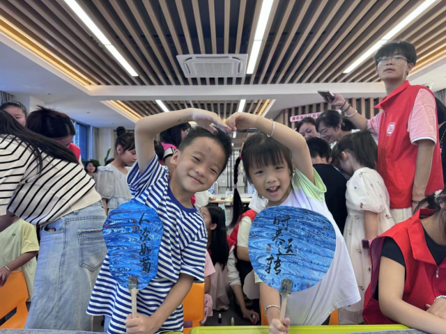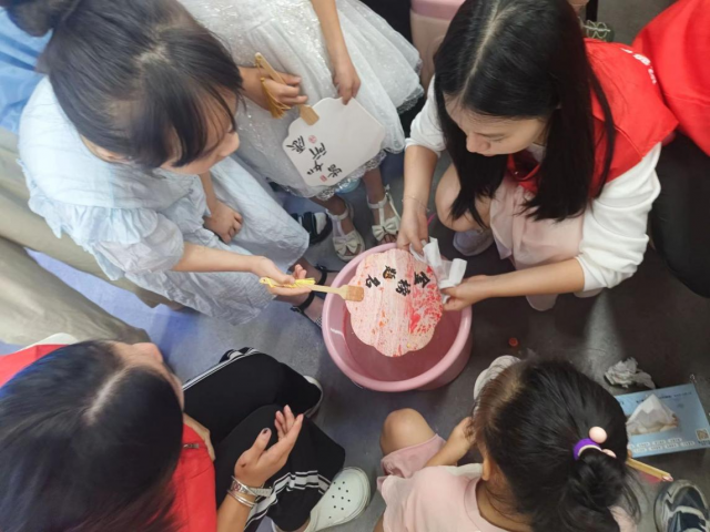 紧接着,在课堂上又带领小朋友们体验非遗文化——漆扇,王书怡同学向大家演示颜料入水、落扇、扇制作漆扇的各个环节,之后都让小朋友上台体验,切实让孩子们亲身体会到传统文化的独特魅力。