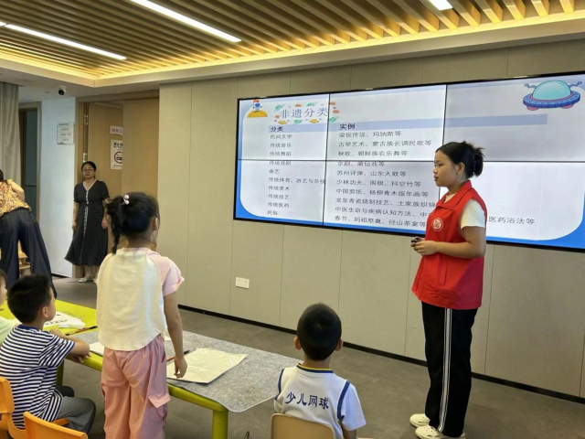 首先,周怡同学给小朋友们讲述了什么是非遗文化,并且展示了“国画”、“漆扇”、“书法”等优秀传统文化,通过讲述,前来参加的大人和孩子们不仅增长了知识,还激发了对传统文化的兴趣和热爱。