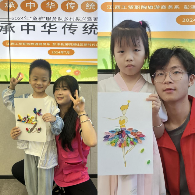 不止漆扇,课堂最后一个环节由王书怡带领孩子们学习衍纸画的制作,在服务队队员们的教导下小朋友将五彩的衍纸卷成圆圈,再捏出各种形状,最后粘贴在一起,就贴出了一张美丽的图画。