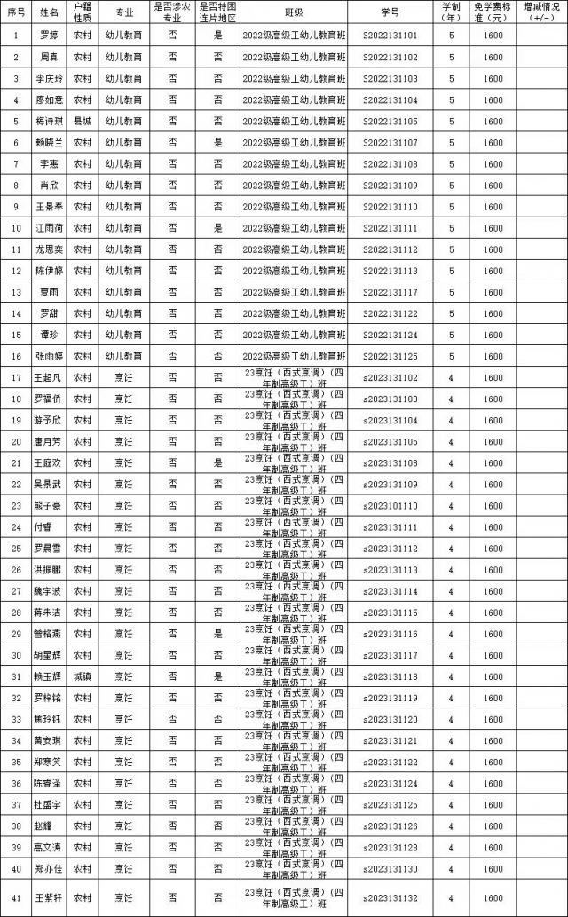 根据做好2024年秋季学期中等职业教育国家助学金及免学费评选工作的通知,专业系秉着坚持公开、公平、公正的原则,严格按规定的程序,系部成立了评议小组并于2024年9月30日开展2022级、2023级高级工专业学生国家免学费评审工作会议,评审小组已对各班级推荐学生的资格和申请材料进行审核,确认参与学院评审的学生符合资格、申请材料真实有效、名单一致。经过各班级评议以及专业系评审小组评审复核评议,现将2022级、2023级高级工专业国家免学费名单公示如下:罗婷等41名同学为技工学校国家免学费评定对象