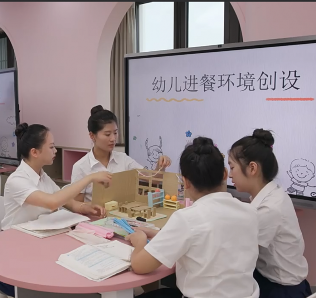 环境是重要的教育资源,就像一位不会说话的老师。幼儿园的进餐环境创设更是作为一种“隐性课程”,发挥着环境育人的功能。 9月19日上午,周宇珑、孙莉两位老师在综合实训大楼幼教实训室开展了进餐环境创设创意活动,参与人员主要有23学前1.2.3班的创客们。两位老师接到校企合作幼儿园发来的邀请,将邀请创客团队中的成员去幼儿园进行进餐环境改造。为了更好地完成任务,老师们让每个小组画好进餐布局图,并说了自己设计理念。在整个设计过程中,两位老师积极指导,对同学的疑问也耐心的解答。