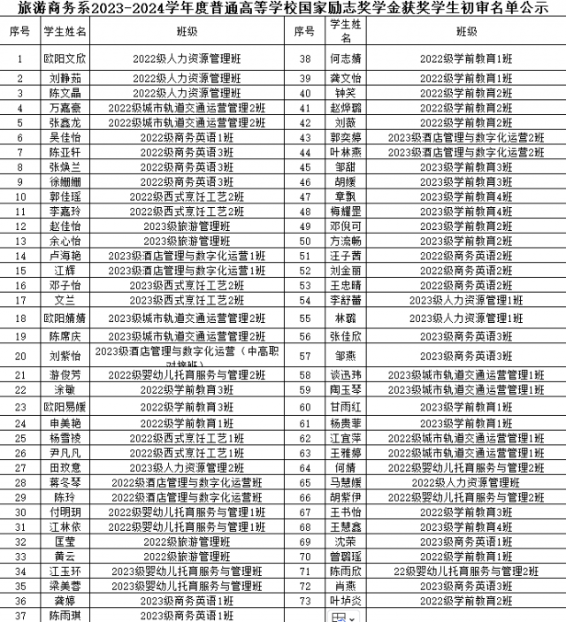 (根据学院下发的指标数调整)根据江西省学生资助管理中心《关于做好2024年高校本专科生国家奖助学金评审及资金发放工作的通知》要求和江西工业贸易职业技术学院《国家奖学金、国家励志奖学金、国家助学金管理暂行办法》等文件精神,我系坚持公平、公正、公开和择优的原则于2024年10月24日开展国家励志奖学金评审工作会议,系部成立资助评议小组,由副主任、教研室主任、行政人员、学工办老师代表组成评议小组成员,经学生个人申请、班级推荐、系资助工作评审小组评审,现研究决定,拟推荐欧阳文欣等73位同学参加学院2023-2024学年国家励志奖学金候选人予以公示。 公示时间为2024年10月24日-10月30日,对公示有异议者,请联系系学生资助工作评议小组成员处。 黄婧(系资助工作组组长、芳泽楼307) 079183777939 刘萍(学生管理员、芳泽楼304) 079183777863 邮箱:790323773@qq.com