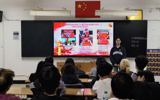 青马工程学员程子贤深入23城市轨道交通运营管理1班团支部开展宣讲,指出作为新时代青年,我们应当认真学习党的二十届三中全会精神,投身到中国特色社会主义伟大事业中,为实现中华民族伟大复兴的中国梦贡献自己的智慧和力量。
