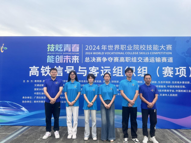 技炫青春,能创未来。10月27日至10月30日,2024年世界职业院校技能大赛总决赛争夺赛“高铁信号与客运组织(高职组)”赛项在柳州铁道职业技术学院顺利举行。来自全国30个省、自治区、直辖市的52支队伍共208名选手选手齐聚柳州,同台竞技。由我系黄聪骢、张洪照老师指导,黄昊老师领队,城市轨道交通运营管理专业学生王雅婷、江宜萍、许艳敏、王康平四位同学组成的代表队,经过激烈角逐,凭借卓越的专业素养和出色的表现,荣获全国铜奖。