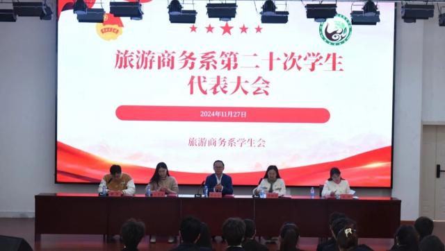 为深入贯彻落实党的二十届三中全会精神,进一步增强学联学生会组织和工作的政治性、先进性、群众性,进一步推动学联学生会工作高质量发展,2024年11月27日下午13:00,旅游商务系第二十次学生代表大会在志学楼505隆重召开。本次大会由黄昊老师主持,出席本次的大会领导和嘉宾有学院团委书记陈永乐、学院团委黄雅萍、旅游商务系党支部组织委员汪思园、学生管理员刘萍,出席代表有学生会代表、学生代表以及社团代表共77人。